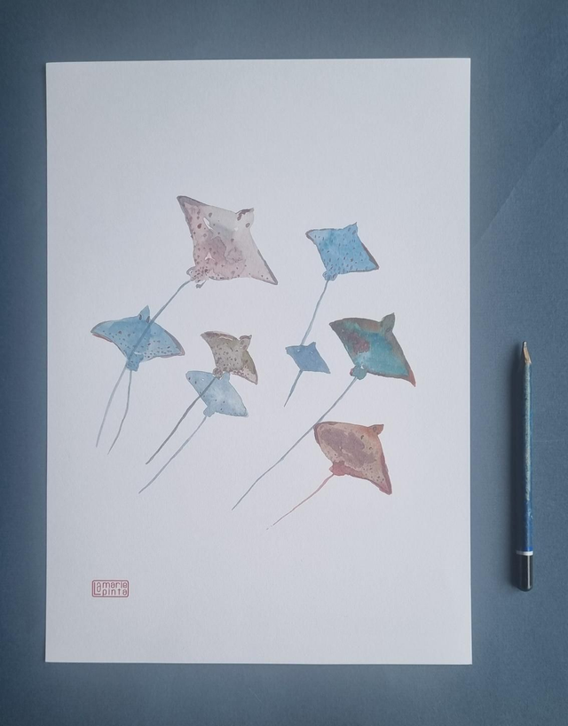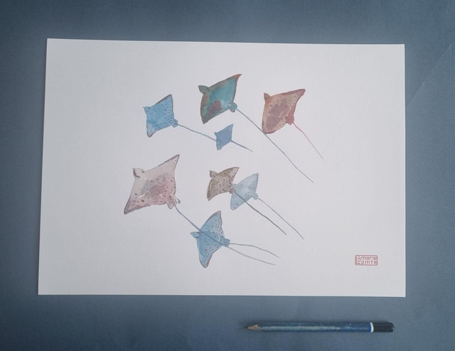 Laissez-vous captiver par la grâce des profondeurs. Cette reproduction fidèle de mon aquarelle originale capture le mouvement fluide et les motifs graphiques de la Raie Léopard. C'est une œuvre d'art qui apporte une touche d'élégance aquatique et de lumière à votre intérieur.